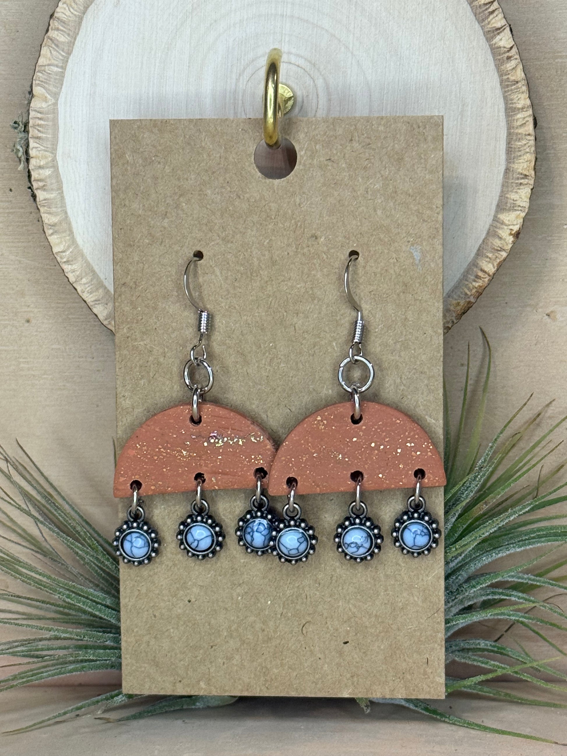 A perfect blend of earthy and celestial, our Desert Sky Dangles feature warm terracotta clay with subtle gold flecks, paired with faux turquoise drops in an antique silver setting. These half-moon shapes mimic the setting sun over the high desert, while the blue charms bring in a pop of cool sky energy.